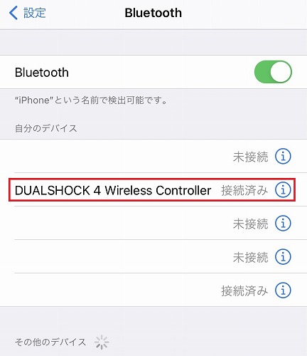 そうすると、デュアルショック4の頭のライトバーっていうの?が赤く光りだしますので、それを確認してiPhoneの設定>Bluetoothに進むと、