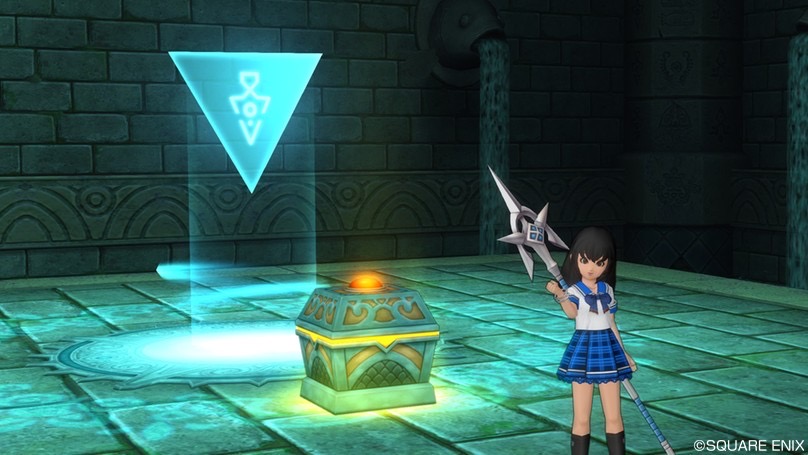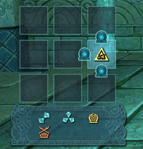黄色の三角はスタート地点のしるしです。入ると青い三つ葉のようなものがありますね。これは「海神のうろこ」と言い、これが次の部屋に行くためのカギのようなものです。