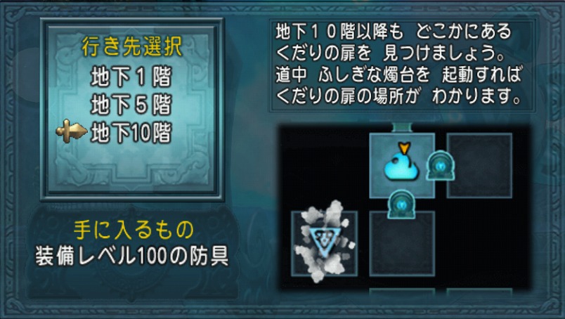 初回からの場合、Lv100装備が欲しいとなったら、地下1階⇒地下5階(Lv99)⇒地下10階(Lv100)というふうに、最低3回はプレイする必要があります。