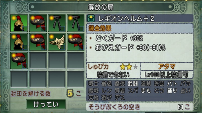 右から2番目の2段目をご覧いただくと、見事に「ソポスの額冠」を無事ゲット!ただ、★2モノでした(;^ω^) が、これで一応セット装備が揃えられたので、しばらくはこれでやって行けそうです♪ ただ、冷静に考えると、何この偏り……。
